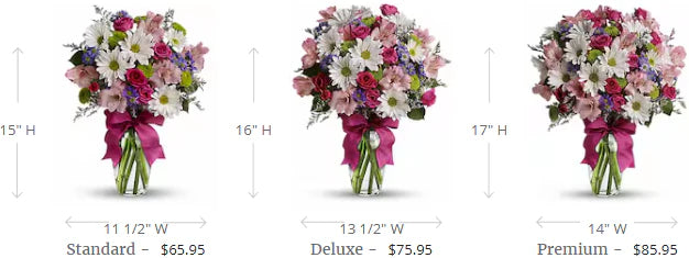 A mix of fresh flowers such as spray roses, daisy and button spray chrysanthemums, Monte Cassino asters and limonium, in shades of white, pink, green, purple and lavender. Delivered in a vase adorned with a matching ribbon.